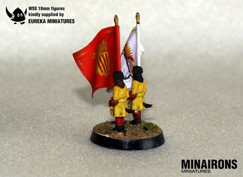 I'd like to show you today what do look like the 1:100th version of a recently released WSS flags set, held by the appropriate flag bearers kindly provided by Eureka miniatures. These are the flags of a catalan austrophile unit, known as Our Lady of Rosary IR.